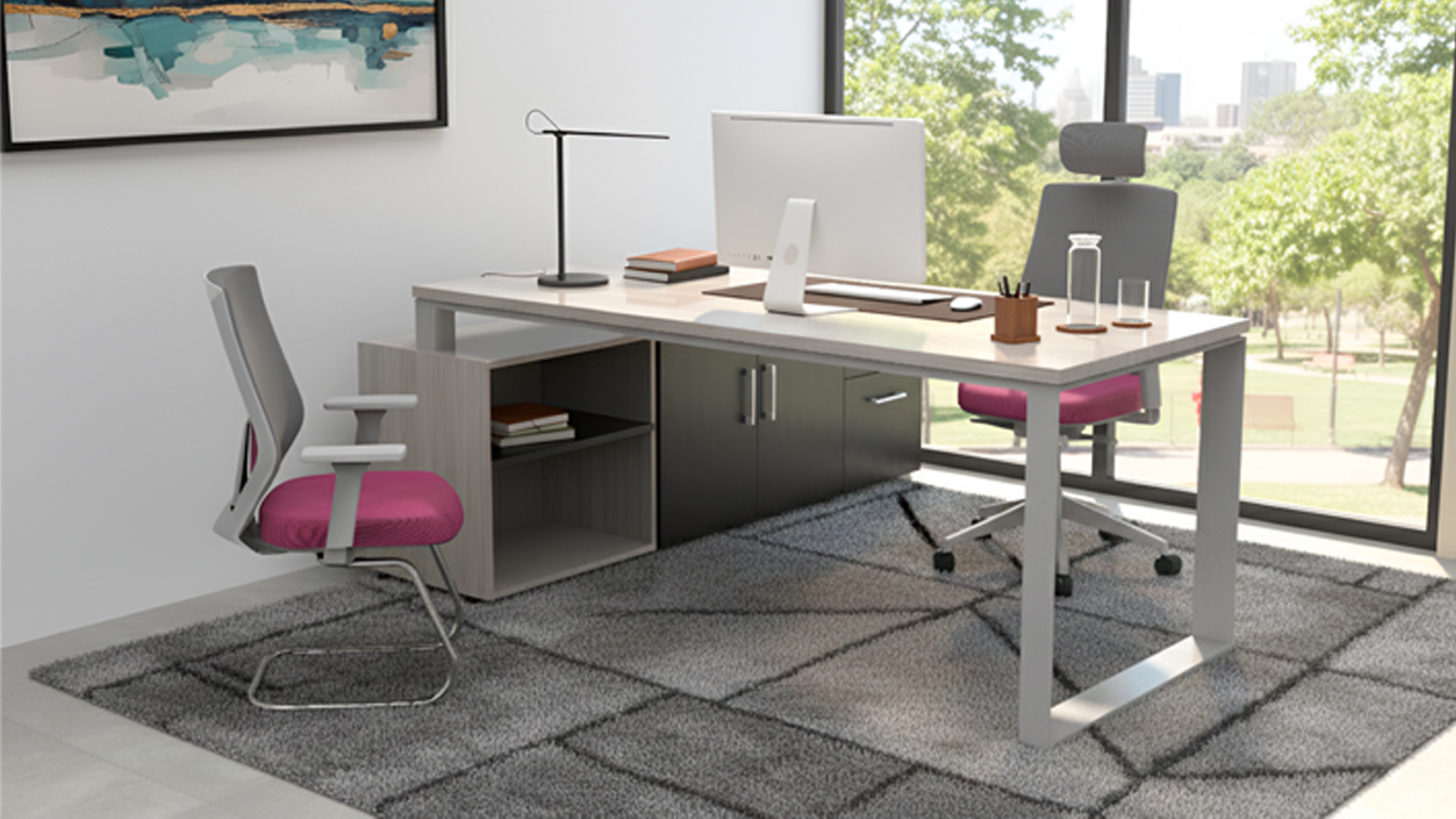 Escritorio ejecutivo sobre credenza lateral, soportería en metal tipo cuadro.